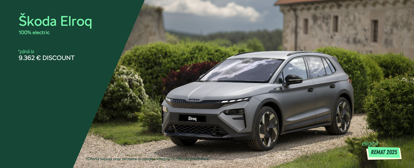 Modelul este eligibil pentru programul Remat 2025**. Tichetul Remat în valoare de 3700 € cu TVA va fi scăzut suplimentar din oferta de preț a modelului Škoda Elroq conform ofertei specificate mai sus.