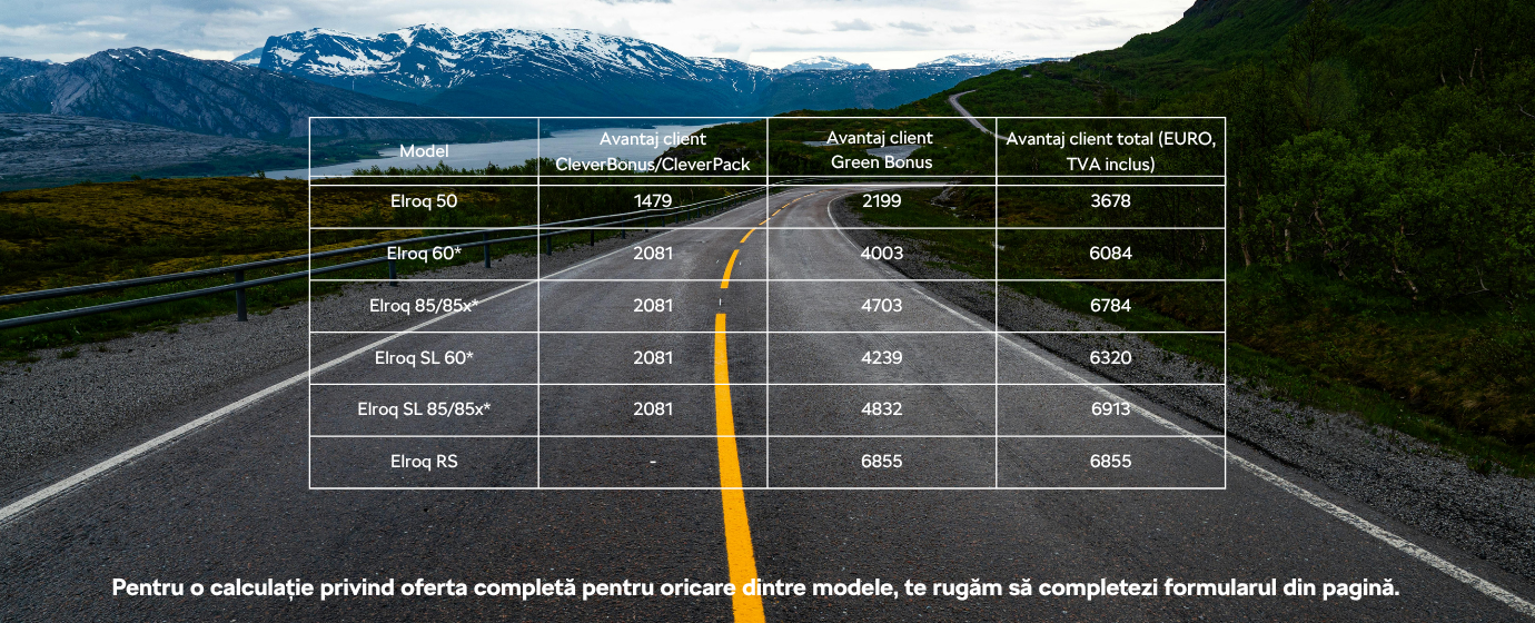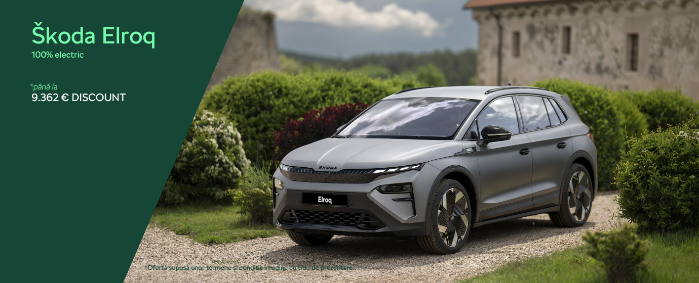 *Discountul total în valoare de 9.362 € cu TVA (46.810 lei) este calculat pentru Škoda Elroq 85X, cu preț final de vânzare de 40.435 € cu TVA (202.175 lei). Discountul include Clever Bonus în valoare de 2.081 €, Green Bonus în valoare de 4.832 € și bonus financiar Smart Bonus 2.449 € oferit de PFG. Oferta de leasing financiar Smart Bonus este valabilă la Avia Motors Constanța până la 09.01.2026, în conformitate cu condițiile campaniei Porsche Finance Group Romania. Clever Bonus și Green Bonus sunt valabile la Avia Motors Constanța până la 30.11.2025.