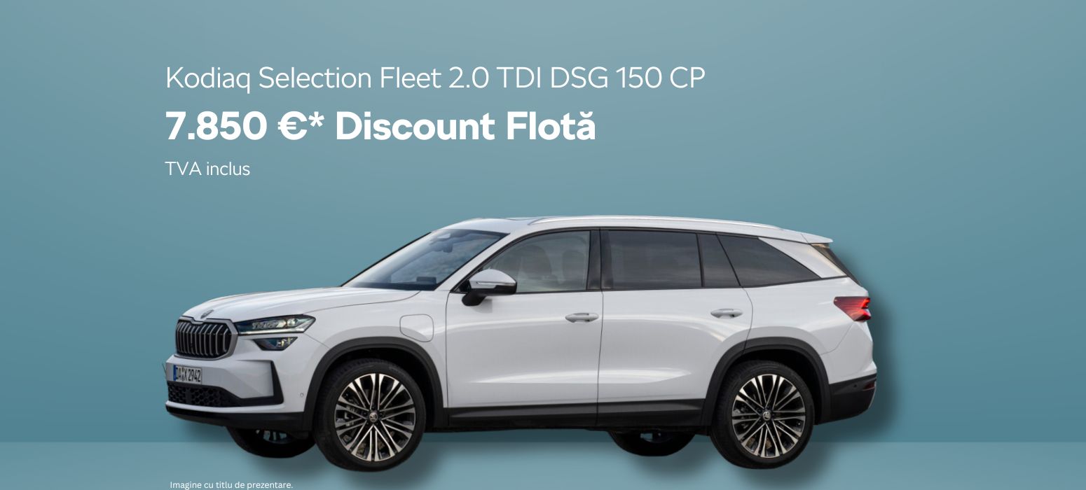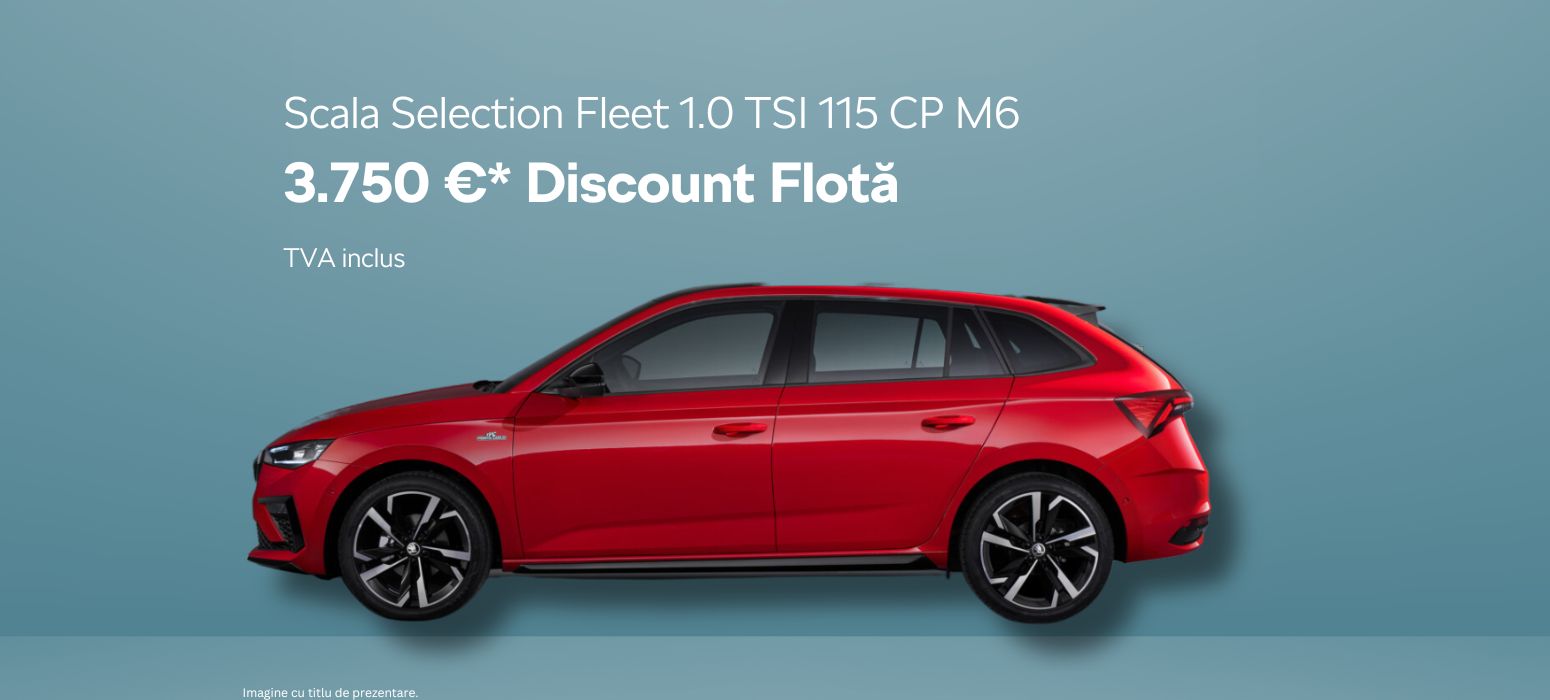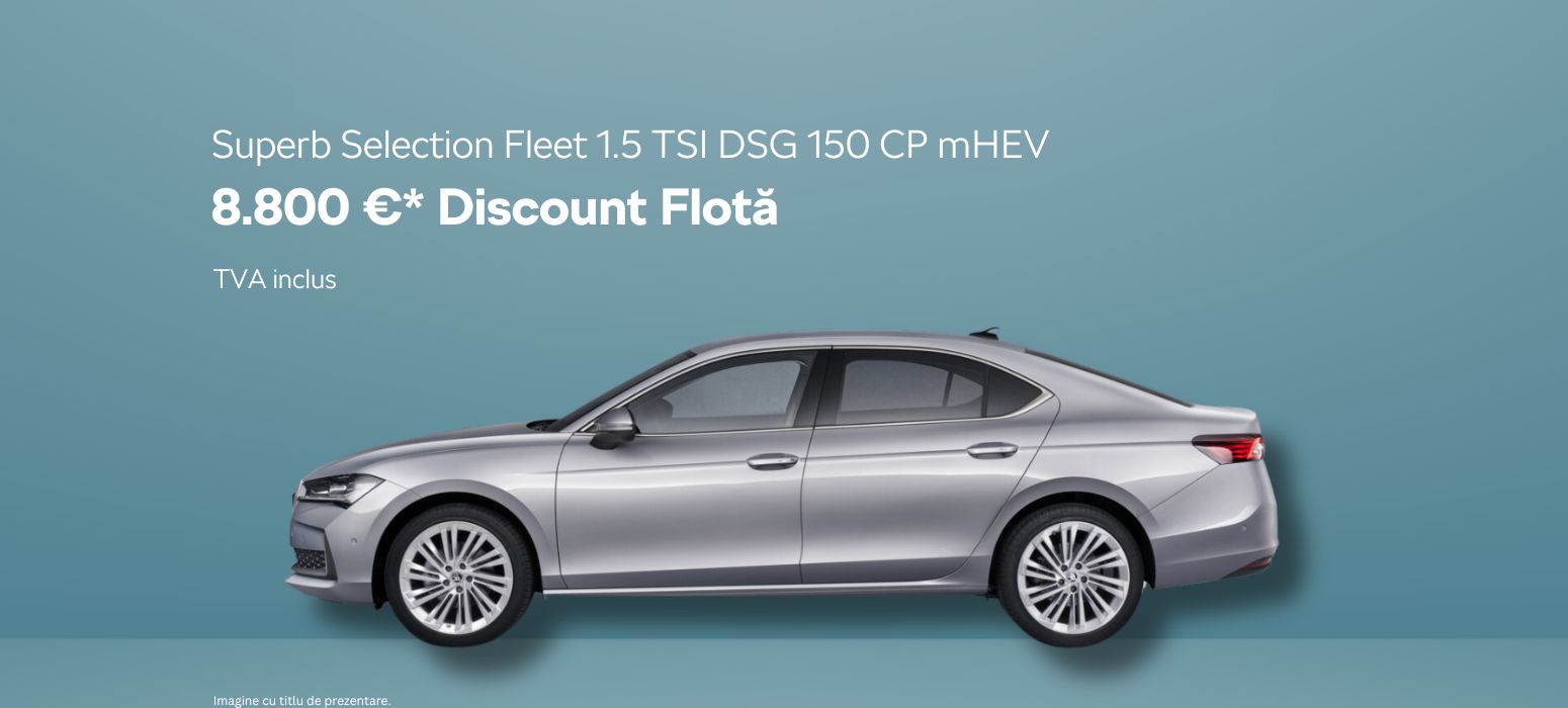 *La achiziția a minimum 5 unități dintr-o categorie de model, te califici la un anumit prag de discount, de până la 8.800 euro, valabil pentru modelul Superb Selection Fleet 1.5 TSI DSG 150 CP.