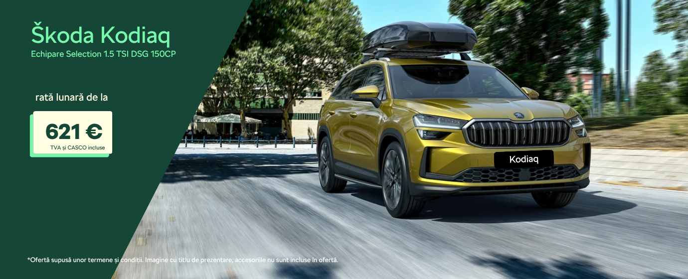 *Rata lunară de leasing în valoare de 621 € cu TVA (3.105 lei) este calculată pentru Škoda Kodiaq Selection 1.5 TSI DSG 150CP, cu preț final de vânzare de 37.344 € cu TVA (186.720 lei) ce include bonus financiar 2.549 € și Clever Bonus 3.000 € oferite de PFG. Rata de leasing financiar conține asigurare Casco și este calculată pentru următoarele condiții: persoane fizice, 25% avans, 60 luni, valoare reziduală inclusă în rată. Oferta de leasing financiar Smart Bonus este valabilă la Avia Motors Constanța până la 09.01.2026, în conformitate cu condițiile campaniei Porsche Finance Group Romania.