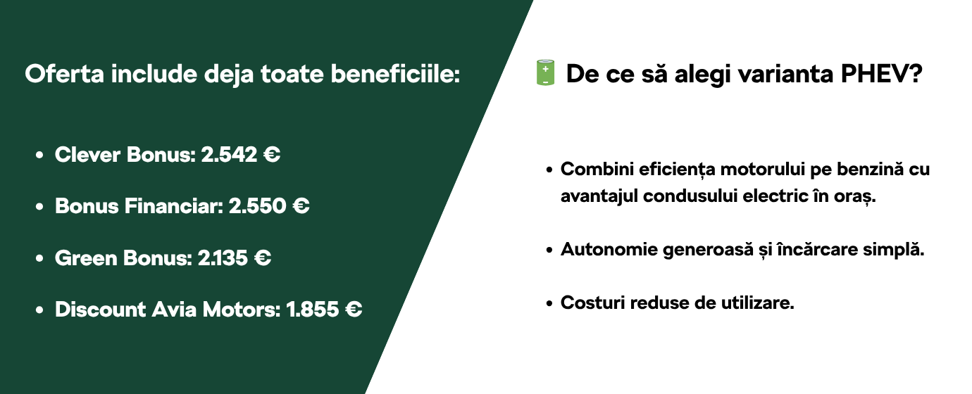 *Oferta de preț este calculată pentru modelul Superb Selection PHEV în valoare de 46.390 € cu TVA (231.950 lei cu TVA) ce include: Clever Bonus: 2.542 € (12.710 lei), Bonus Financiar: 2.550 € (12.750 lei), Green Bonus: 2.135 € (10.675 lei) și Discount Avia Motors: 1.855 € (9.275 lei).