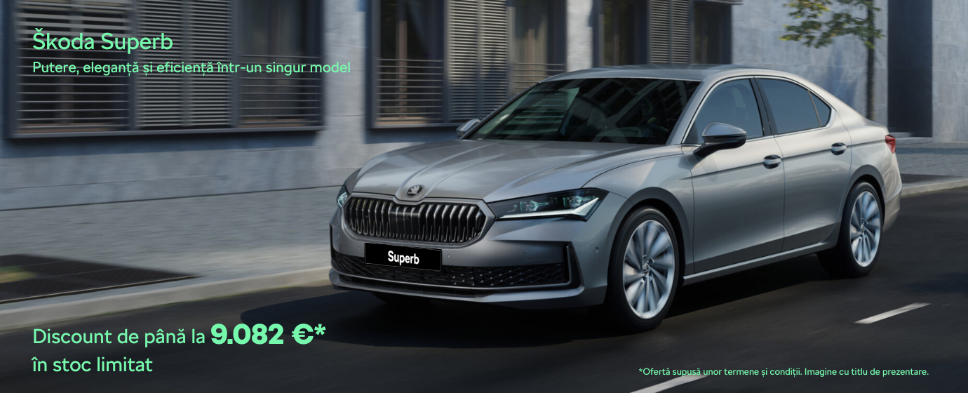 Până la data de 31.12.2025, ai ocazia să alegi un model Škoda Superb PHEV (Hybrid benzină + E plug-in), disponibil imediat, la un preț final excepțional de 41.985 € (TVA inclus)*.